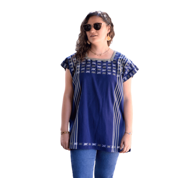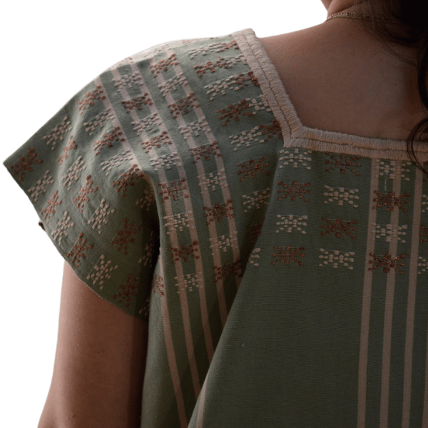 Tejido en telar de cintura y brocado tradicional de San Juan Cancuc, Chiapas. Cada Huipil Estrella requiere 90 horas de trabajo. El hilo brillo utilizado para el brocado fusiona la tradición de las prendas tzeltales con colores y combinaciones más actuales, lo que añade un toque de elegancia y modernidad a la pieza. Este huipil es un reflejo de la dedicación y el talento de las 12 artesanas tzeltales que conforman la ESMAS Ach’jalab Antsetic.